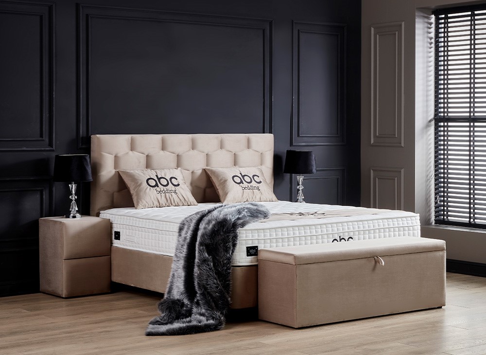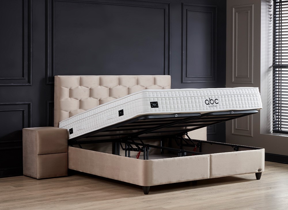 lit box avec espace de rangement, matelas ressorts Bonnel 5 tours, sur matelas mousse HR35 tissu velour beige 160cm 1299€, 180cm 1399€ le prix comprend le box, la tête de lit , le matelas avec le sur matelas table de nuit 179€ pièce coffre 269€