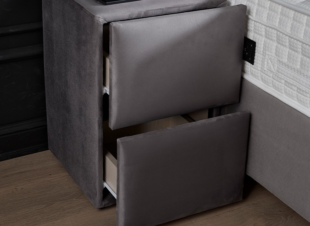 it box avec espace de rangement, matelas ressorts Bonnel 5 tours, sur matelas mousse HR35 tissu velour gris 160cm 1299€, 180cm 1399€ le prix comprend le box, la tête de lit , le matelas avec le sur matelas table de nuit 179€ pièce coffre 269€